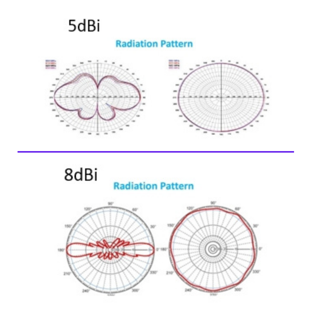 5dBi: Without obstructions, our antenna is designed to travel up to 8 km. The radiation pattern is much more rounded in shape which is suitable for more witnesses closer by.